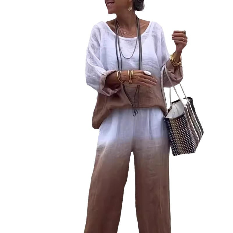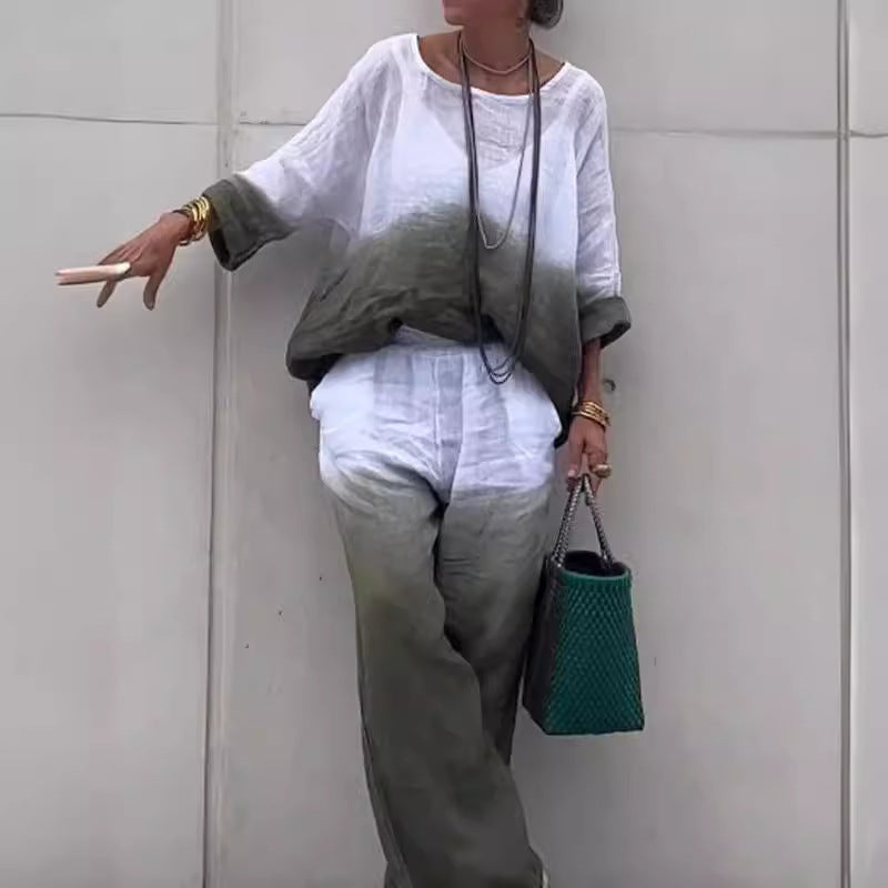 Women's Fashion Cotton Linen Gradient Two-piece Set