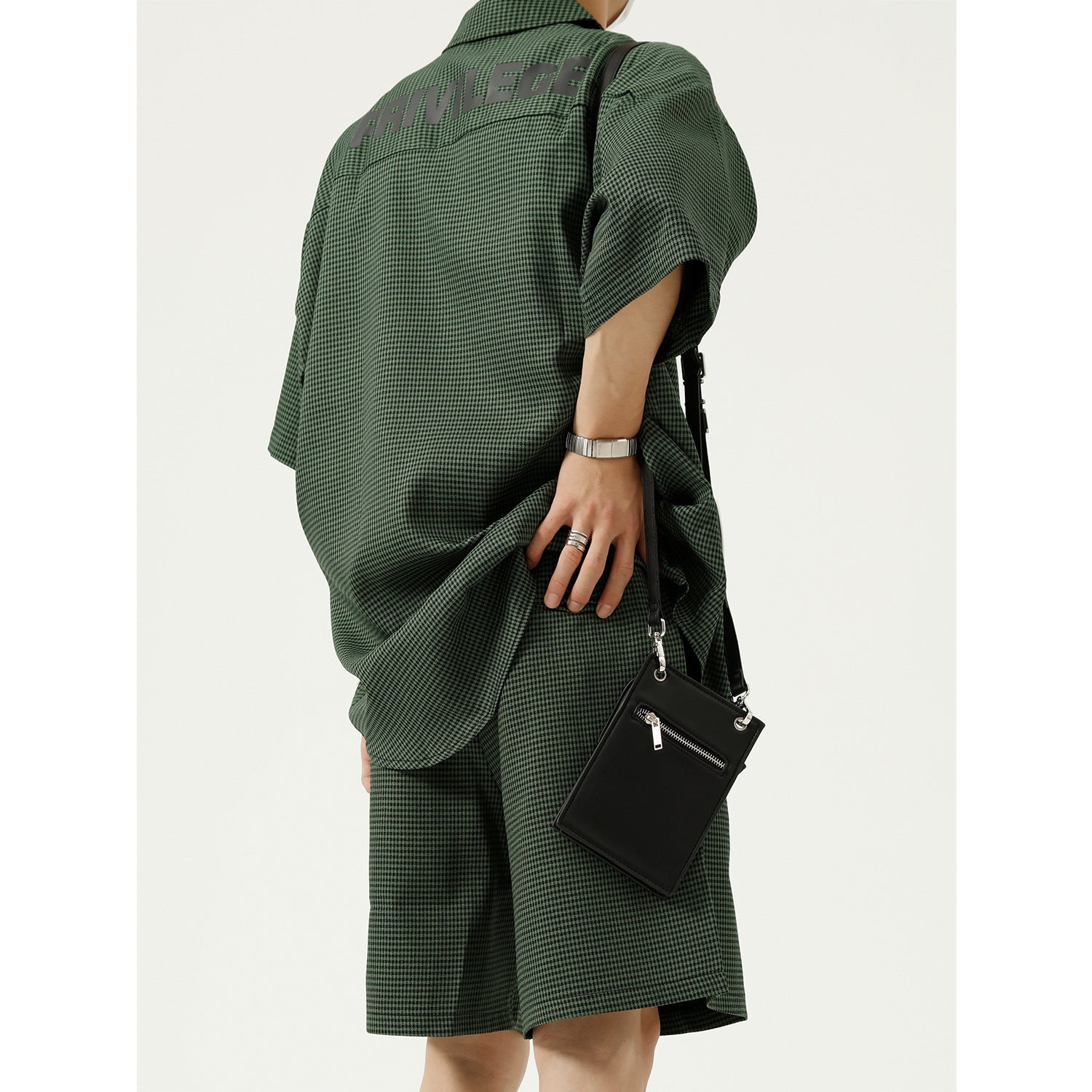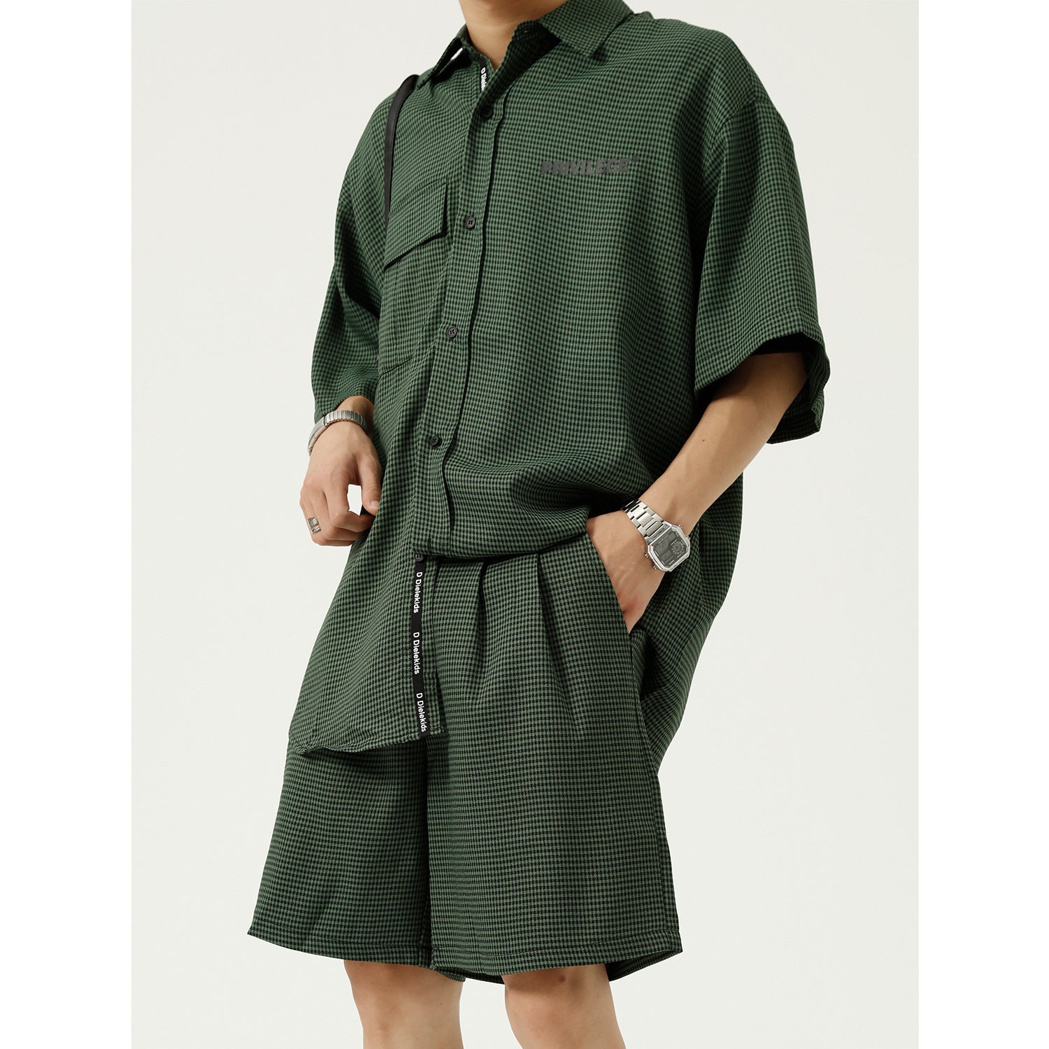 Color: blue and white checkered shirt, blue and white checkered trousers, black and green checkered shirt, black and green checkered trousers