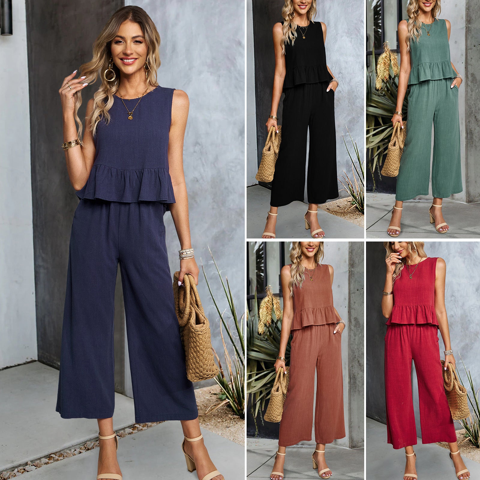 Women's Sleeveless Shirt Wide Leg Cotton And Linen Cropped Pants Set